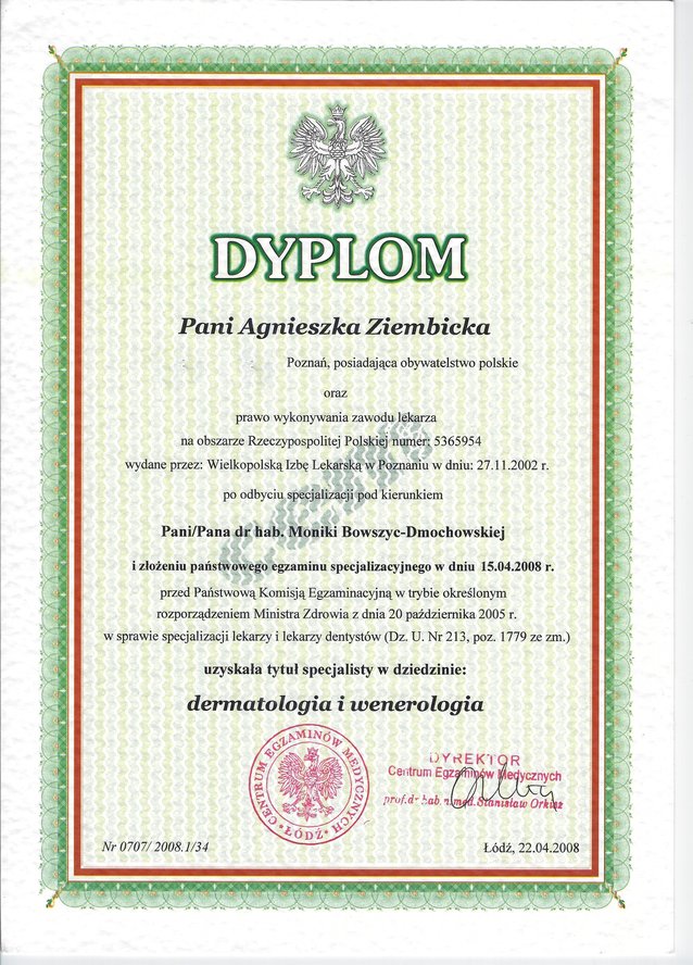 Jestem absolwentką Akademii Medycznej w Poznaniu, specjalistką II stopnia w zakresie dermatologii i wenerologii, z dwudziestoletnim doświadczeniem zawodowym, zdobywanym bezpośrednio po zakończeniu stażu podyplomowego w pracy w Klinice Dermatologii Akademii Medycznej w Poznaniu, Przyklinicznej Poradni Dermatologicznej jak i równoczesną pracą w Poradniach Dermatologicznych w Poznaniu i poza jego granicami. Od kilkunastu lat pracuję również w Centrum Medycznym HCP, gdzie oprócz porad w Poradni Dermatologicznej, konsultuję pacjentów na wszystkich obecnych tam oddziałach szpitalnych.